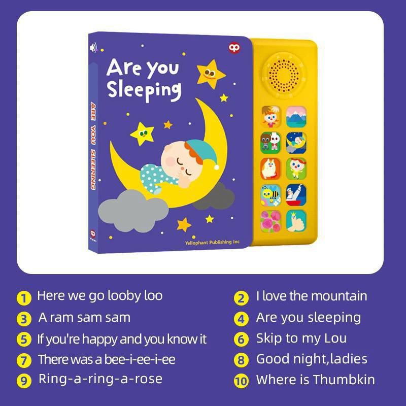 這款兒童互動音樂故事書以經典童謠「你睡了嗎?」為主題,結合了閱讀、音樂和互動遊戲,為孩子們帶來豐富的學習體驗。故事書採用鮮豔的色彩和可愛的插圖,搭配易於操作的音樂按鈕,讓孩子們在輕鬆愉快的氛圍中學習。書中收錄了多首經典童謠,包括「Here we go looby loo」、「A ram sam sam」、「If you're happy and you know it」、「There was a bee-i-ee-i-ee」、「Ring-a-ring-a-rose」、「I love the mountain」、「Skip to my Lou」、「Good night, ladies」和「Where is Thumbkin」等,讓孩子們在唱歌跳舞的同時,培養音樂感和節奏感。