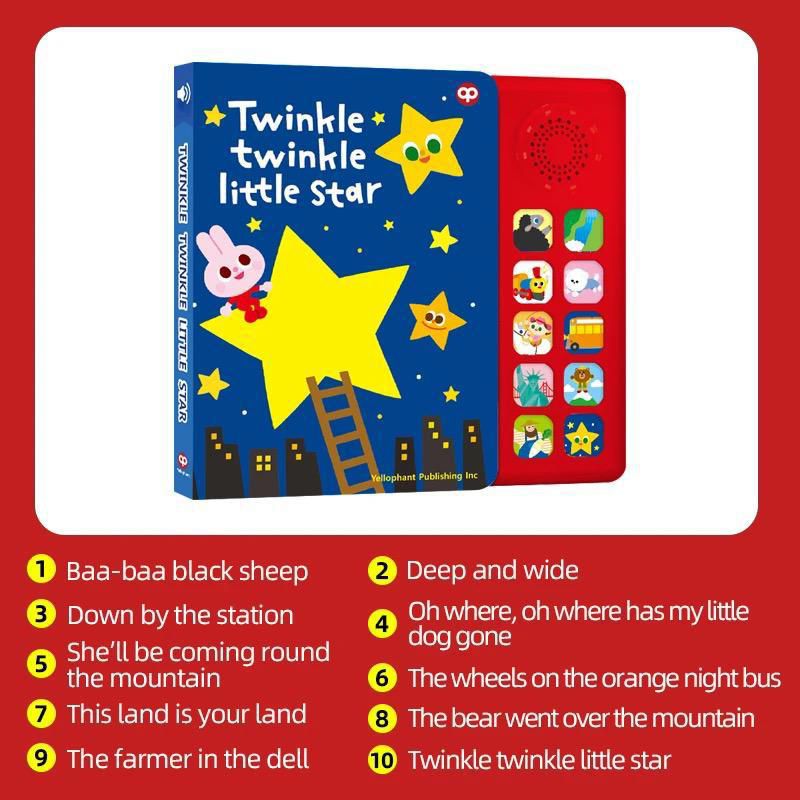 這款兒童音樂故事書以「閃爍小星星」為主題,設計精美,色彩鮮豔,旨在為孩子們提供一個互動式的學習體驗。這本書不僅是一本故事書,更是一個多功能的學習工具,結合了音樂、故事和互動元素,激發孩子們的學習興趣,培養他們的認知能力和語言能力。