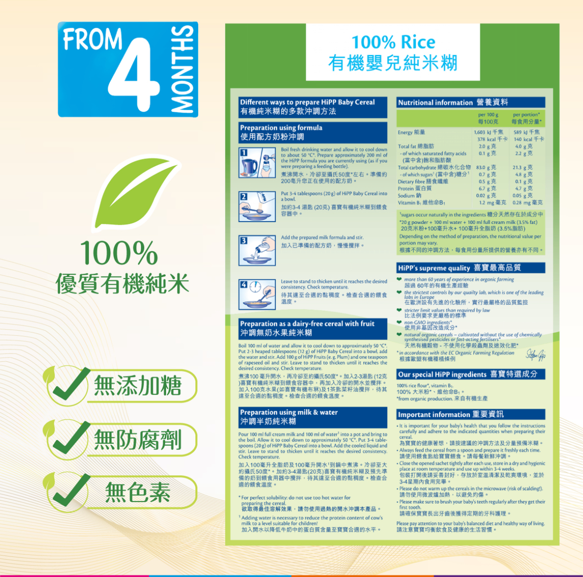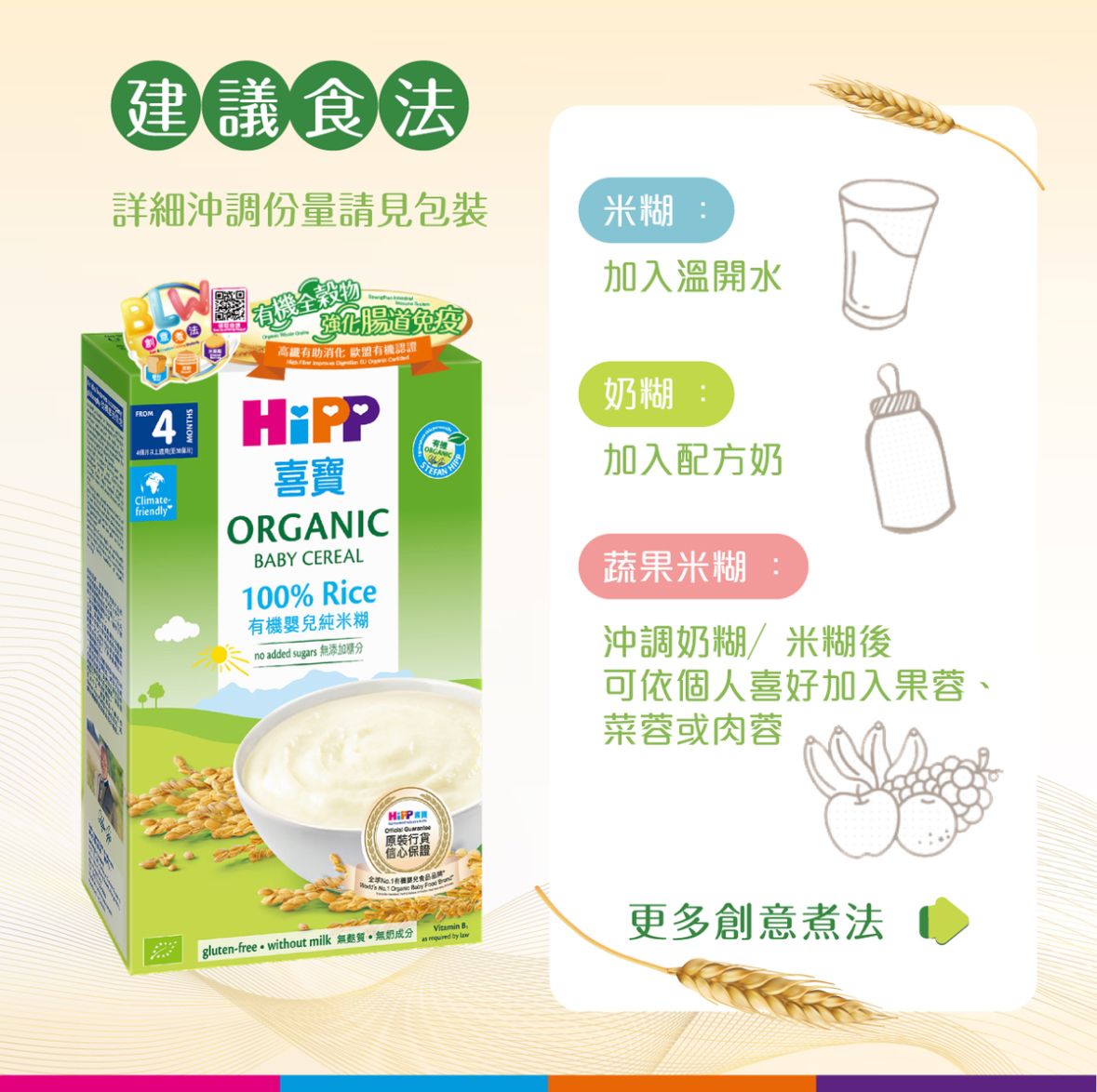 HiPP喜寶有機米糊以100%有機穀物製造,絕不過份添加礦物質(包括鐵質),易於消化。當中蘊含維他命B1^,有助神經系統發展。以母乳或配方奶粉沖調,讓寶寶熟悉温和奶香味,質地幼滑、可口。天然營養已足夠成長所需,給寶寶第一口理想輔食品。特別適合你親自為寶寶調配米糊。