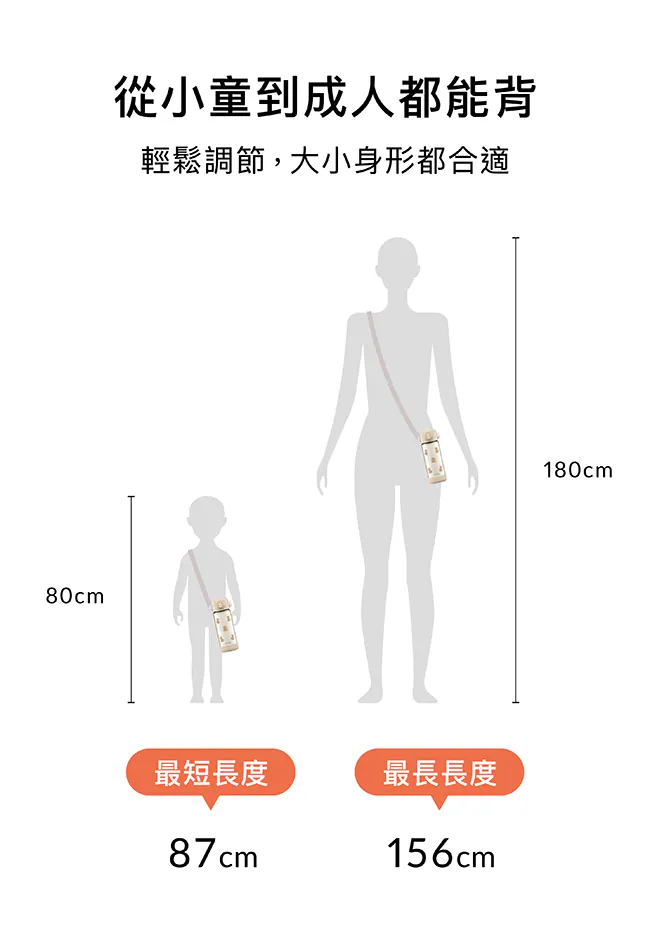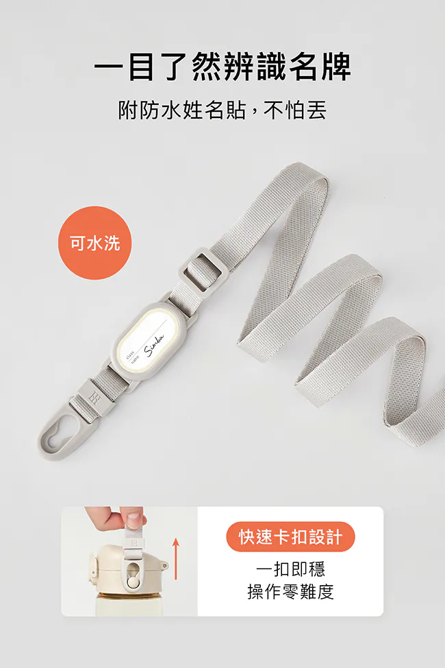 自由切換肩背模式 背著走讓小手更自由 400ml順順杯專用背帶 產品特色 •自由切換肩背模式,滿足日常多場景攜帶需求。 •一目了然辨識名牌,附防水姓名貼,不怕丟。 •背帶最短長度87cm,最長長度156cm,從小童到成人都能背。 •本產品僅適用於鉑金PPSU兒童水壺400ml(吸管型/直飲型)。 材質 塑膠、聚酯纖維 使用方式 將背帶扣套於中蓋左右兩側並調整適當長度。 注意事項 •以手洗滌水溫不超過40°C,切勿機洗及消毒。 •請經常檢視本產品,若有斷裂、破損、鬆脫等情形,請立即更換。 •請勿讓嬰幼兒獨自使用,應由成人陪同,以確保安全。 •請勿將本產品纏繞頸部、手腳,以免造成窒息或勒傷危險。 •內附防水姓名貼,請使用油性筆書寫。