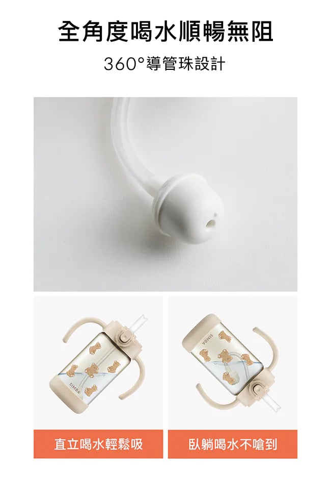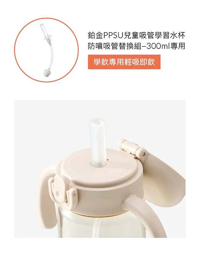 溫水不噴,倒放不漏 360˚全角度喝水不受限 300ml順順杯專用防噴吸管配件 產品特色 •獨家專利Vigor防噴吸管,溫水不噴,倒放不漏。 •嚴選100%食品級白金矽膠,小嘴輕吸即出水。 •360˚導管珠設計,全角度喝水順暢無阻,任何角度都喝得到。 •通過國際SGS嚴格檢驗,不含雙酚A&S、塑化劑、重金屬。 •本產品僅適用於鉑金PPSU兒童吸管學習水杯300ml。 材質 吸嘴/吸管:矽膠(-20°C~+200°C) 吸管接頭/通氣棒:聚丙烯(-20°C~+100°C) 導管珠:SUS304不鏽鋼/聚丙烯(-20°C~+100°C) 使用方式 請依照說明書組裝。 注意事項 •本產品僅供食品接觸用途,並可重複使用。 •本產品含有不鏽鋼配件,請勿使用微波爐加熱,以免造成危險。 •矽膠材質易吸附氣味與色素,建議使用後儘速清洗,若有染色屬正常現象,不影響使用。 •請經常檢視本產品,若有變形、破損、鬆脫等情形,請立即更換。 •請務必詳閱說明書,並依圖表順序組裝吸管組。