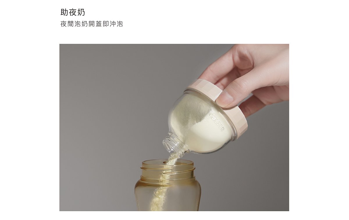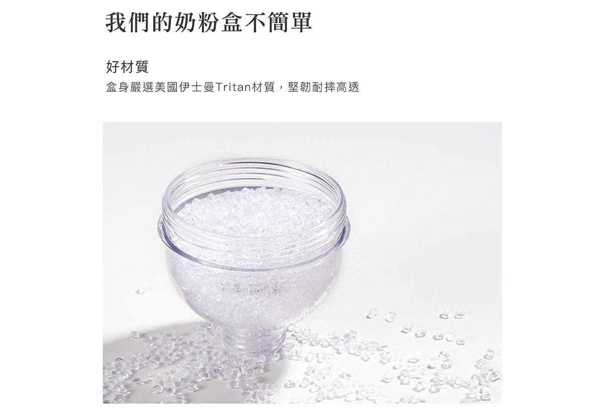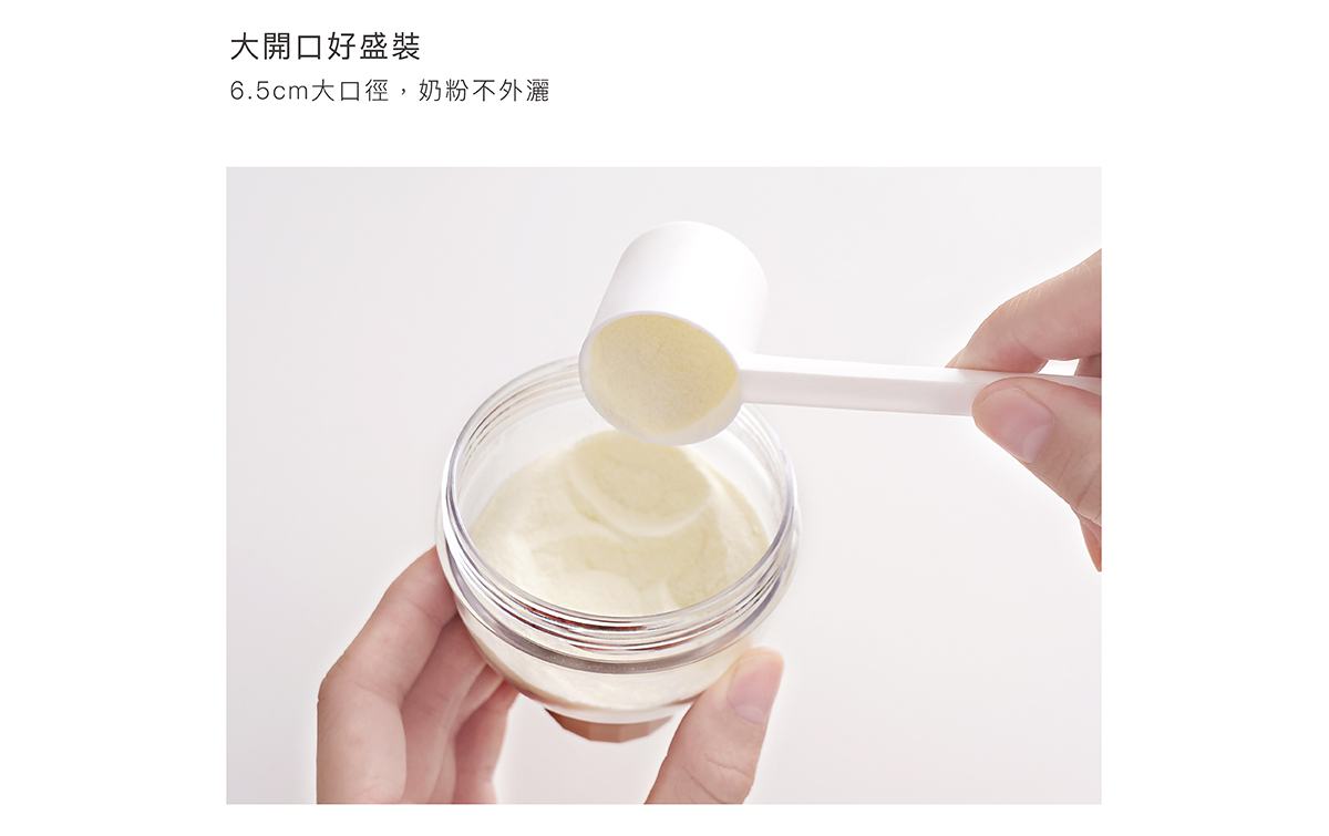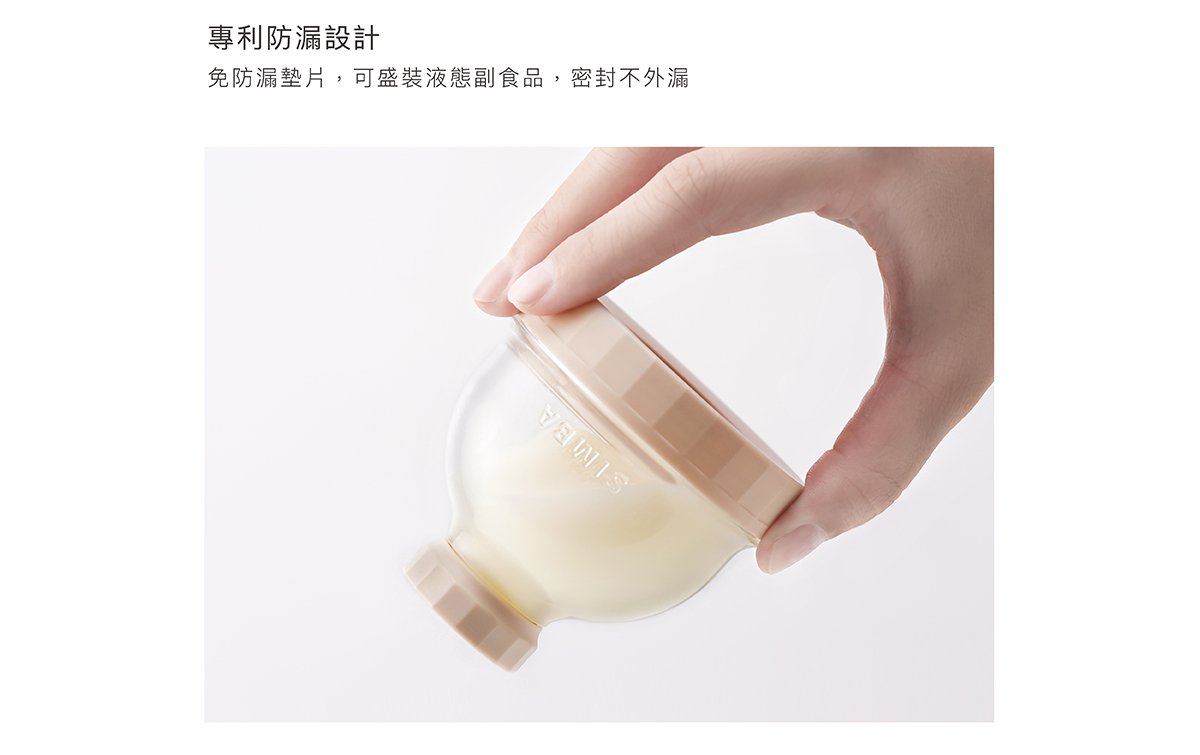 產品特色 •盒身嚴選美國伊士曼Tritan材質,堅韌耐摔高透。 •防滑凸點設計,輕鬆旋緊不費力。 •大開口好盛裝,寬標口適用,即開即用奶粉不外灑。 •大容量,每層最大可盛裝約63g,可沖泡420ml。 •專利防漏設計,免墊片防漏蓋,可盛裝液態副食品,密封不外漏。 •好攜帶,輕巧體積,層層獨立盒裝,可以餐量隨心搭配。 •全配件可拆解,清洗無死角。 使用方式 開蓋即用,可當奶粉罐、密封罐、離乳碗、分裝漏斗。 產品規格 主體:改質PCT(Tritan)( -20℃~+100℃) 蓋子:聚丙烯Polypropylen(-20℃~+100℃) 顏色:氣泡水(藍)/酪梨(綠)/無花果(粉)/肉桂捲(米) 產地:台灣製造 注意事項 •以水煮法消毒時,水煮沸後需先關閉火源,再置入配件消毒3-5分鐘,避免碰觸鍋面。 •使用蒸氣、紫外線…等消毒器,請參照使用說明書使用。 •請勿接近火源或高溫金屬。 •請勿讓嬰幼兒在沒有大人陪伴下使用本產品。 •本產品供食品接觸用途,並可重複使用。