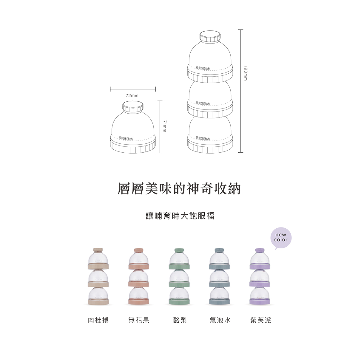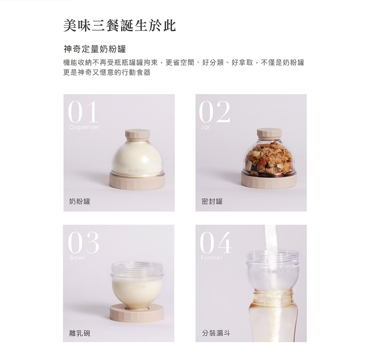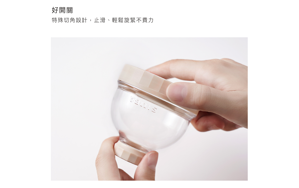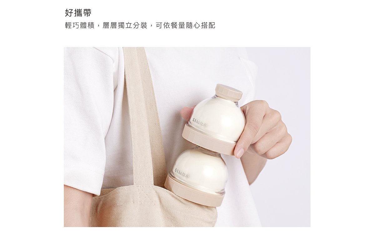 產品特色 •盒身嚴選美國伊士曼Tritan材質,堅韌耐摔高透。 •防滑凸點設計,輕鬆旋緊不費力。 •大開口好盛裝,寬標口適用,即開即用奶粉不外灑。 •大容量,每層最大可盛裝約63g,可沖泡420ml。 •專利防漏設計,免墊片防漏蓋,可盛裝液態副食品,密封不外漏。 •好攜帶,輕巧體積,層層獨立盒裝,可以餐量隨心搭配。 •全配件可拆解,清洗無死角。 使用方式 開蓋即用,可當奶粉罐、密封罐、離乳碗、分裝漏斗。 產品規格 主體:改質PCT(Tritan)( -20℃~+100℃) 蓋子:聚丙烯Polypropylen(-20℃~+100℃) 顏色:氣泡水(藍)/酪梨(綠)/無花果(粉)/肉桂捲(米) 產地:台灣製造 注意事項 •以水煮法消毒時,水煮沸後需先關閉火源,再置入配件消毒3-5分鐘,避免碰觸鍋面。 •使用蒸氣、紫外線…等消毒器,請參照使用說明書使用。 •請勿接近火源或高溫金屬。 •請勿讓嬰幼兒在沒有大人陪伴下使用本產品。 •本產品供食品接觸用途,並可重複使用。
