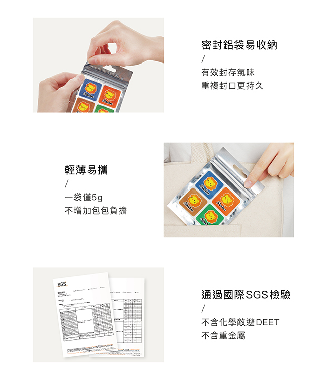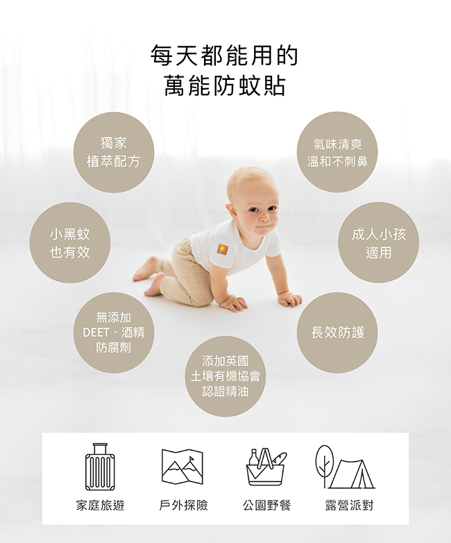 產品特色 -無添加DEET、酒精、防腐劑,成人、小孩適用 -嚴選經英國土壤協會COSMOS有機認證檸檬草、香茅、尤加利精油 -經實驗證實,有效驅離埃及斑蚊、熱帶家蚊、小黑蚊...等多種蚊蟲 -選用3M高品質背膠,不易殘膠、不傷嬌嫩肌 -室內長達72小時有效保護,戶外長達12小時有效保護 -通過國際SGS嚴格檢驗,不含化學DEET、重金屬 -加量版,一次32枚特別價 使用方式 撕開鋁袋及背膠,將防蚊貼片貼於衣物,可長時間維持蚊避防護圈 產品規格 材質:高密度無紡布、背膠 成分:檸檬草精油、香茅精油、尤加利精油、植物性配方 尺寸:約3.5X3.5cmX32枚入 效期期限:本產品在完整鋁箔包裝下可保存3年,開封後,使用效果會因時效、溫濕度、空氣流通度...等不同而異 產地:台灣製造
