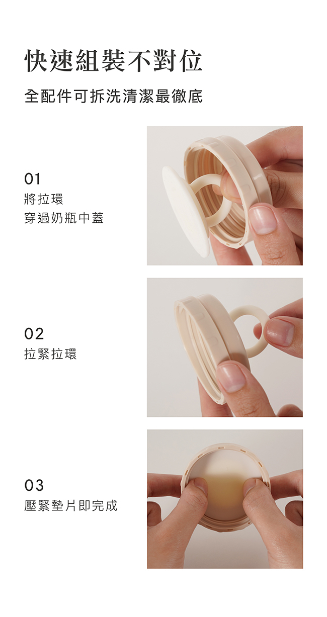 產品特色 •為奶瓶口徑精準量製,零滲漏,保存母乳最純粹的味道。 •符合人體工學的易提勾環。 •螺旋鎖定防漏結構,瓶蓋密封性極佳,一滴不漏不走味。 •配件全拆洗清潔最徹底,可蒸氣、水煮、紫外線消毒。 •適用標準口徑奶瓶。 產品規格 材質:矽膠 (-20℃~+120℃) 口徑:標準口徑 注意事項:玻璃系列奶瓶不適合用於冷凍儲乳 產地:台灣製造 使用方式 將拉環穿過奶瓶中蓋並拉緊,壓緊墊片即完成。 注意事項 本產品供食品接觸用途,可重複使用,如有變形或缺損等情形,請立即更換新品