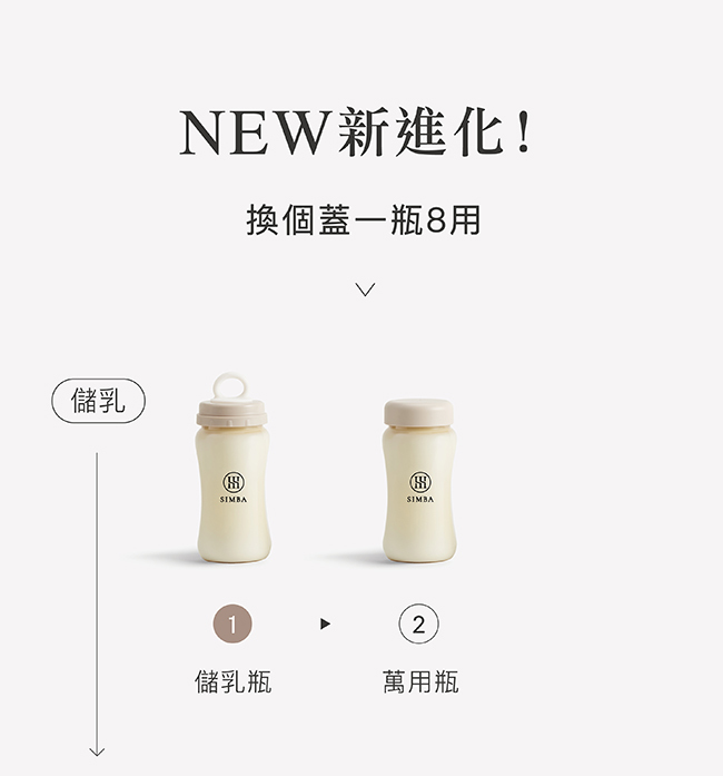友善收納,一蓋即變身儲乳瓶、輔食罐、零食罐…等萬用瓶。 螺旋鎖定防漏結構,瓶蓋密封性極佳,一滴不漏不走味。 配件全拆洗清潔最徹底,可蒸氣、水煮、紫外線消毒。 僅限使用於小獅王辛巴寬口徑奶瓶