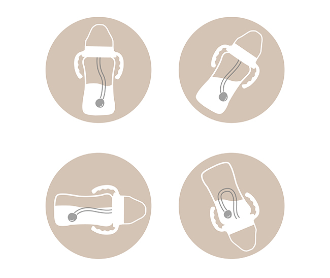 依說明書裁剪吸管長度,組裝吸管配件後將奶瓶穿過中蓋,壓緊蝶片並套入防滑把手,旋緊瓶蓋即完成。
