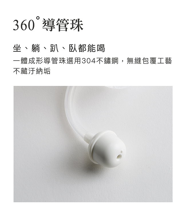 •360˚導管珠,坐、躺、趴、臥都能喝。