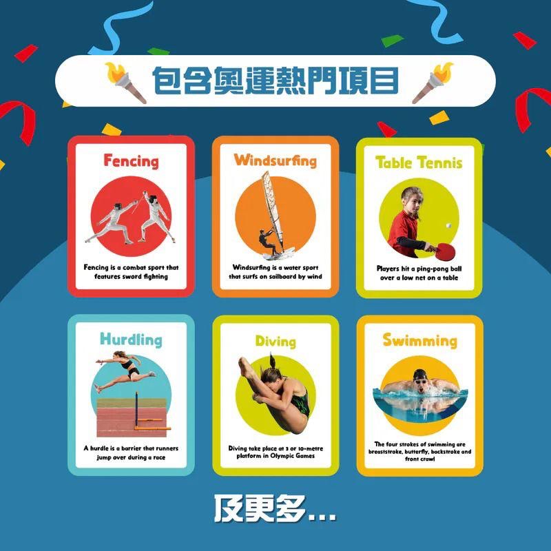 Curios®️ 英文運動配對卡 🛍️3-6星期到貨 👉🏻 內含奧運熱門項目,如跨欄、跳水、花劍、風帆等 👉🏻 學習30個英文運動詞彙 👉🏻 一盒有齊30張英文運動字卡+30張運動配對小卡 👉🏻 每張卡配有運動小知識 👉🏻 高質素雙面卡,前後配對實物圖畫 👧🏻 適合1-6歲,撕唔爛厚卡