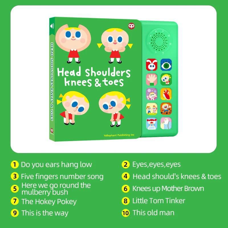 這本書包含多首經典的兒童歌曲,如“Do You Ears Hang Low”、“Eyes, Eyes, Eyes”、“Five Fingers Number Song”等。每首歌曲都配有相應的按鈕,孩子們可以輕鬆地按下按鈕來播放音樂,跟著音樂一起唱歌跳舞。此外,這本書還具有互動功能,可以幫助孩子們學習身體部位的名稱,如頭、肩膀、膝蓋和腳趾,讓他們在玩樂中學習知識。