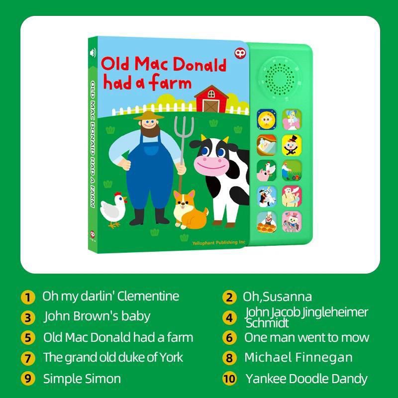 這是一款專為兒童設計的互動音樂書,名為「Old Mac Donald had a farm」。這本書不僅色彩鮮豔、插圖精美,更結合了音樂和互動功能,讓孩子們在閱讀的同時,也能享受音樂的樂趣。書的封面以農場為主題,描繪了老麥克唐納、各種動物以及農場的田園風光,色彩明亮,能夠立即吸引孩子們的目光。